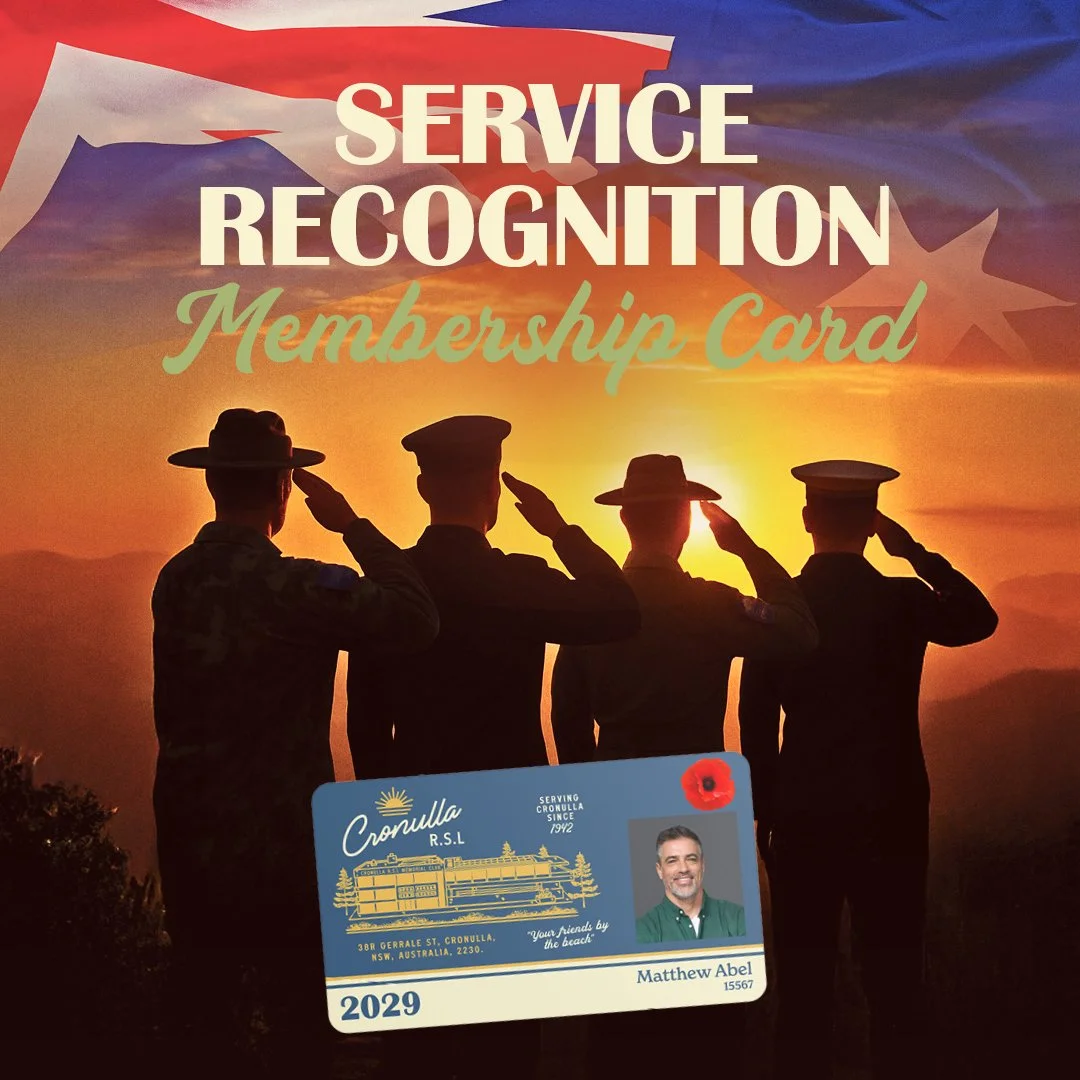 In keeping with its proud tradition of supporting the veteran community, Cronulla RSL is proud to introduce the Service Recognition Membership Card — a heartfelt initiative that acknowledges the courage, sacrifice, and continued service of our current and ex-serving Defence Force members.