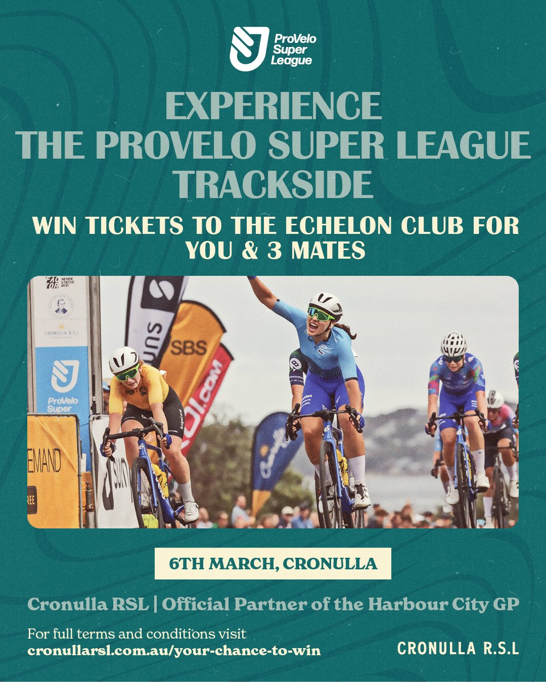 Cronulla RSL is giving you and three mates the chance to win VIP tickets to the Echelon Club at the Cronulla RSL Criterium on Friday, 6th March!