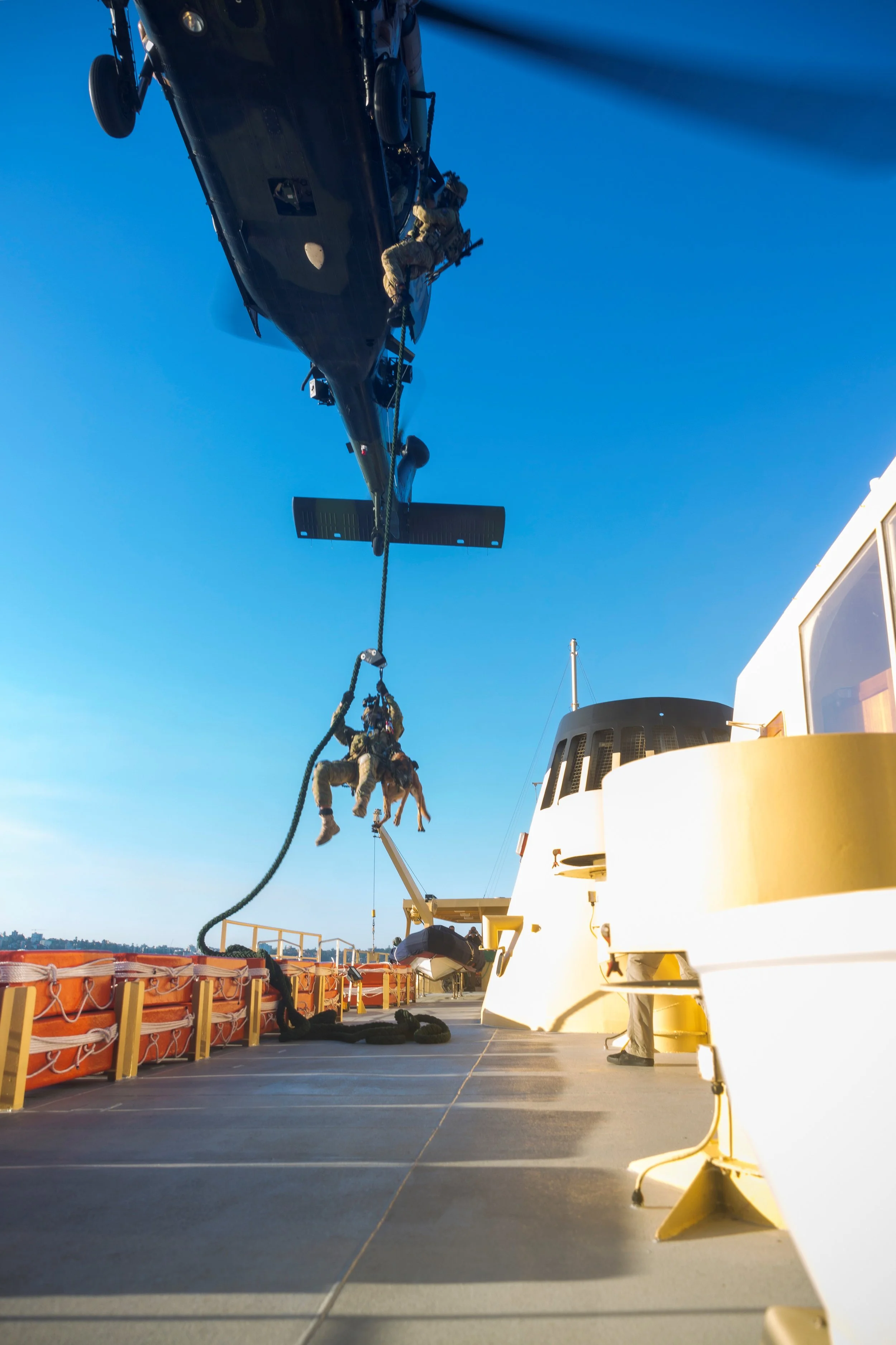 Fast Roping: Manic was trained to fast rope; this is a technique for descending a thick rope, allowing troops to deploy from a helicopter in places where the aircraft cannot touch down.